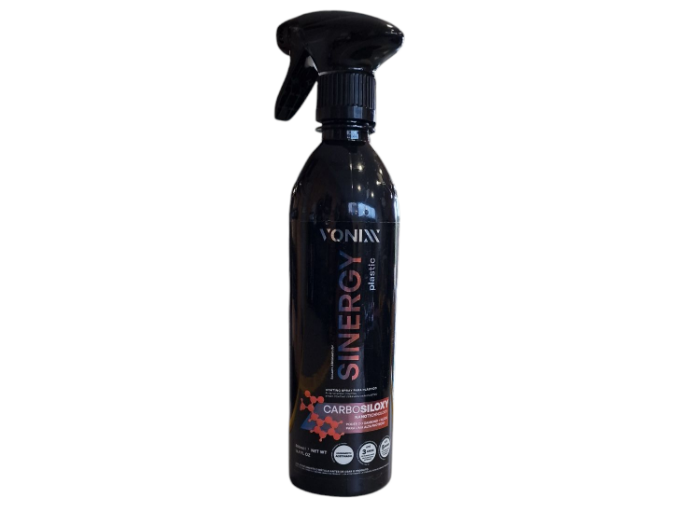 Sinergy plastic spray coating é um protetor a base de água, que contém carbono e silício agindo em sinergia para promover proteção de até três anos nos plásticos internose cinco meses nos plásticos externos do veículo. A tecnologia Carbosiloxy, faz com que o carbono presente na composição faça uma dupla fixação do silício no plástico, afim de aumentar a durabilidade.